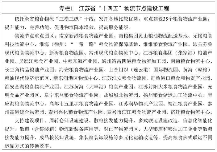 強化糧食物流通道能力。針對不同區(qū)域特點補齊設(shè)施短板,強化功能升級,加強通道銜接,增強東隴海線、淮河出海線、沿長江、沿海、沿京杭運河線、沿連申內(nèi)河線“三橫三縱”糧食物流通道能力。加強徐州(新沂、沛縣)、連云港等糧食物流節(jié)點建設(shè),推動?xùn)|隴海線通道鐵路糧食物流干線運輸組織模式向班列化方式轉(zhuǎn)變,提高新亞歐大陸橋鐵路運輸、鐵海聯(lián)運和國際糧食物流通行能力。加強南京、泰州、蘇州、南通等散糧倉儲與物流設(shè)施建設(shè),重點提升沿長江通道糧食接卸、江海聯(lián)運、分撥集散能力,提高服務(wù)長江經(jīng)濟帶的糧食多式聯(lián)運效率。加強淮安、宿遷等物流節(jié)點集散能力,提升沿淮河出海線內(nèi)河散糧運輸和成品糧集裝箱運輸功能。加快連云港、鹽城(大豐港)、南通(通州灣)等港口鐵路支線建設(shè),提升沿海通道糧食專用碼頭、專業(yè)散糧設(shè)施、多式聯(lián)運轉(zhuǎn)運設(shè)施、通用集裝箱裝卸設(shè)施功能。加強揚州、常州、無錫等散糧倉儲與物流節(jié)點建設(shè),提升沿京杭運河線通道糧食接卸、水水中轉(zhuǎn)和分撥集散能力。加強連云港、鹽城、南通等多式聯(lián)運物流節(jié)點與糧食產(chǎn)區(qū)對接,提升沿連申內(nèi)河線鐵水聯(lián)運、河海聯(lián)運等功能,發(fā)展鐵水散糧運輸和成品糧集裝箱運輸。