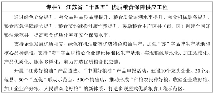 大力推進優(yōu)質(zhì)糧源基地建設(shè)。深入實施優(yōu)質(zhì)糧食保障供應(yīng)工程,推動優(yōu)質(zhì)品種規(guī)模生產(chǎn)和訂單種植,建設(shè)“蘇”字品牌核心生產(chǎn)基地,提升優(yōu)質(zhì)糧食供應(yīng)能力。依托示范縣(市、區(qū))、特色園區(qū)、加工基地、龍頭企業(yè)等載體,培育一批優(yōu)質(zhì)糧源基地。加強蘇北、蘇中糧食基地建設(shè),持續(xù)推進蘇北地區(qū)建設(shè)優(yōu)質(zhì)稻谷、中強筋小麥生產(chǎn)基地,大力推動蘇中沿江及里下河地區(qū)建設(shè)優(yōu)質(zhì)稻谷、專用小麥、雙低油菜、食用大豆生產(chǎn)基地,穩(wěn)定蘇南和西部丘陵地區(qū)優(yōu)質(zhì)稻谷生產(chǎn)。