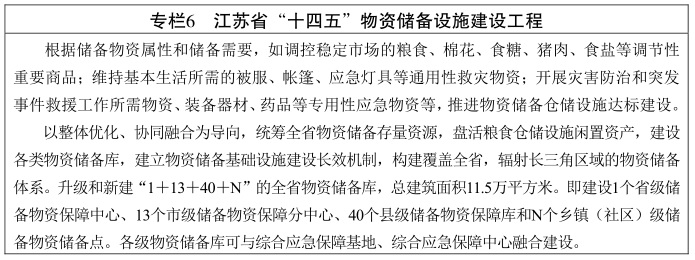 提升物資儲備設(shè)施水平。新建或改擴建一批技術(shù)先進、經(jīng)濟高效、綠色環(huán)保、平急結(jié)合的省、市、縣三級物資儲備庫。多災(zāi)易災(zāi)和人口較多的市縣,應(yīng)按上限標準確定儲備庫建設(shè)規(guī)模,并根據(jù)實際適當增加儲備庫點。制定江蘇物資儲備庫建設(shè)標準,按照啟動自然災(zāi)害救助應(yīng)急預(yù)案Ⅱ級響應(yīng)需求,推進物資儲備庫規(guī)模達標建設(shè),其中,省級建筑面積10000平方米以上,市級建筑面積5000平方米以上,縣級建筑面積1000平方米以上。充分利用好全社會倉儲資源,加快物資儲備設(shè)施標準化、信息化、智能化改造。