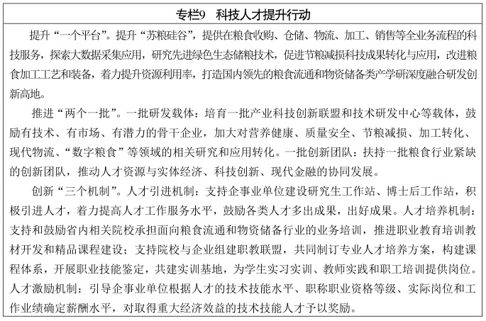 突出創(chuàng)新引領(lǐng),強化科技和人才支撐,加強糧食產(chǎn)業(yè)技術(shù)創(chuàng)新和糧機裝備研發(fā),推進糧食和物資儲備科技創(chuàng)新平臺建設(shè),提升糧食流通和物資儲備數(shù)字化水平,進一步增強糧食流通和物資儲備發(fā)展新動能。