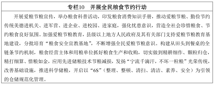 推進重點環(huán)節(jié)節(jié)糧減損。加強糧食生產(chǎn)、儲存、運輸、加工等重點環(huán)節(jié)的損失治理。發(fā)揮好糧食產(chǎn)后服務(wù)中心作用,著力提高糧食清理烘干能力,推動凈糧入倉、顆粒歸倉。推廣運用糧食倉儲新技術(shù)、新工藝、新裝備,推動集約儲糧新模式。發(fā)展新型糧食運輸裝備,提升糧食運輸現(xiàn)代化和裝卸智能化水平。引導(dǎo)支持企業(yè)適度加工,推廣高效低耗新技術(shù),提高成品糧出品率和原糧利用率,提高糧油加工副產(chǎn)品綜合利用率。